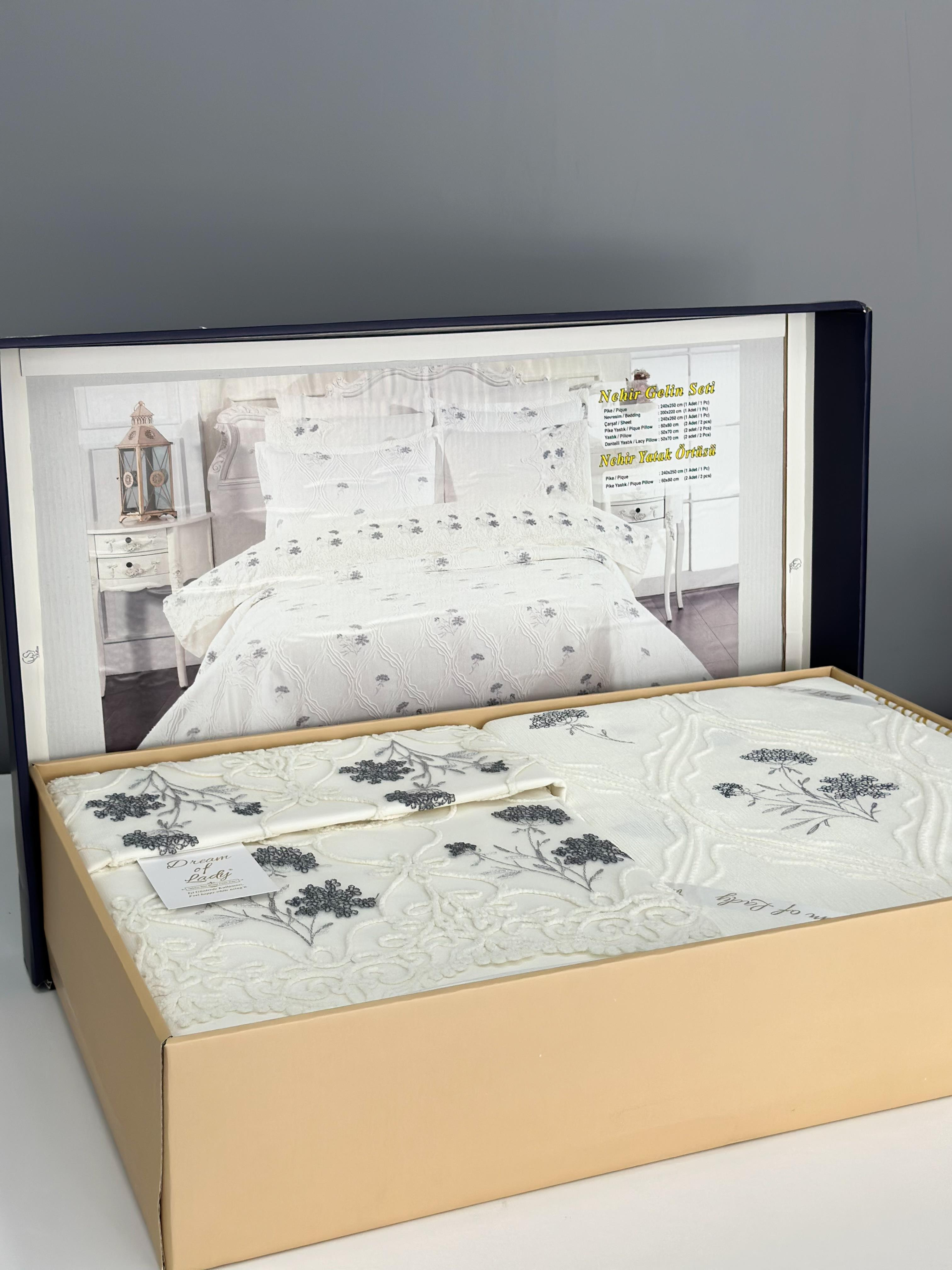 Zarif tasarımı ve şık detaylarıyla Dream Of Lady Nehir Gelin Seti, çeyizinize lüks bir dokunuş katar.