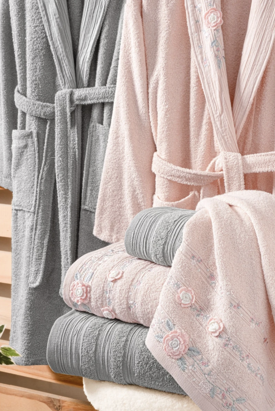2 Adet Bornoz, 2 Adet Baş Havlusu, 2 Adet Banyo Havlusu
