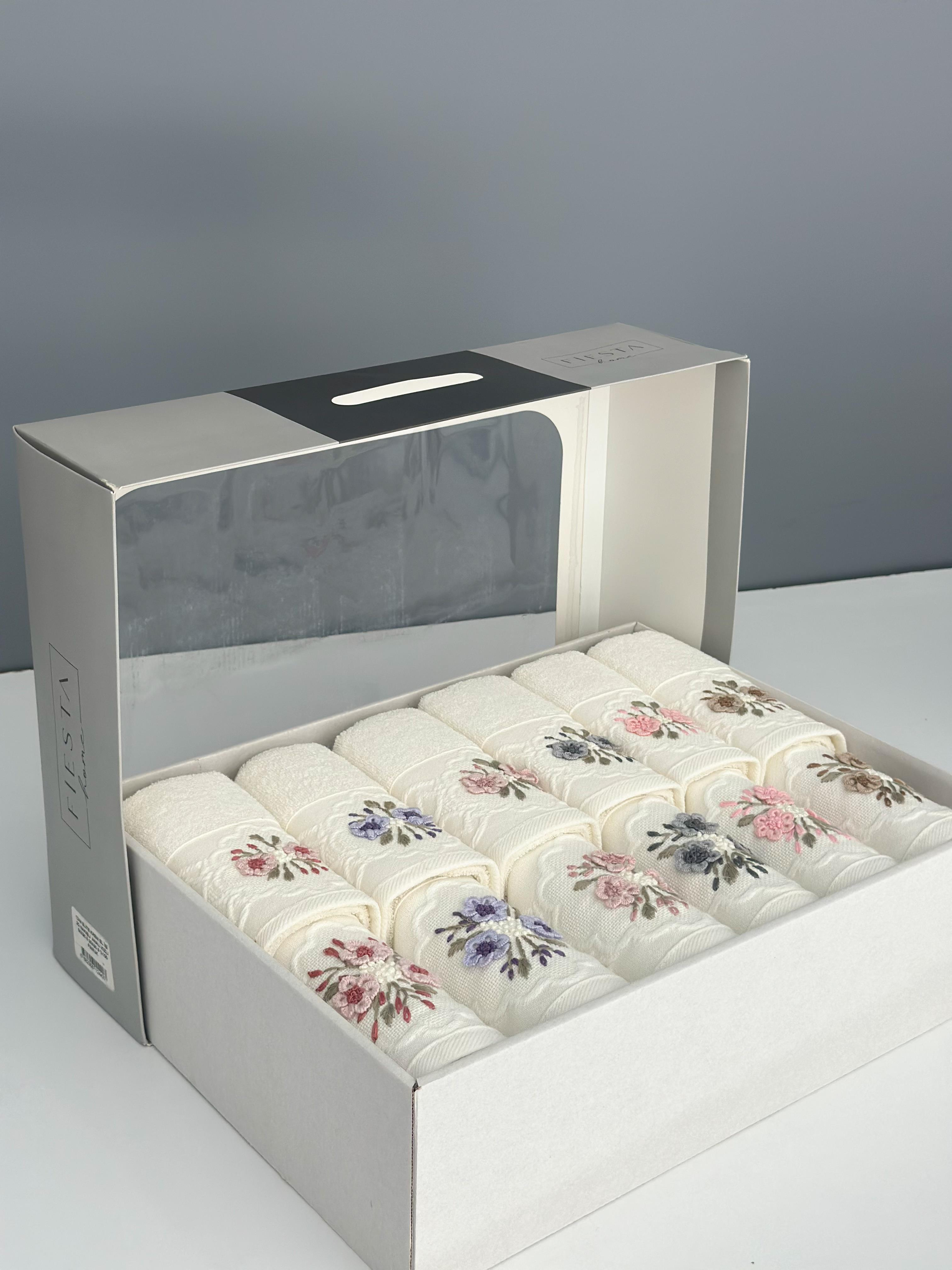 Fiesta Home Elite el işi nakışlı analı kızlı havlu seti, zarif tasarımı ve şık kutu sunumuyla çeyiz bohçalarının gözdesi. El emeği işlemeleriyle banyolara estetik katar.