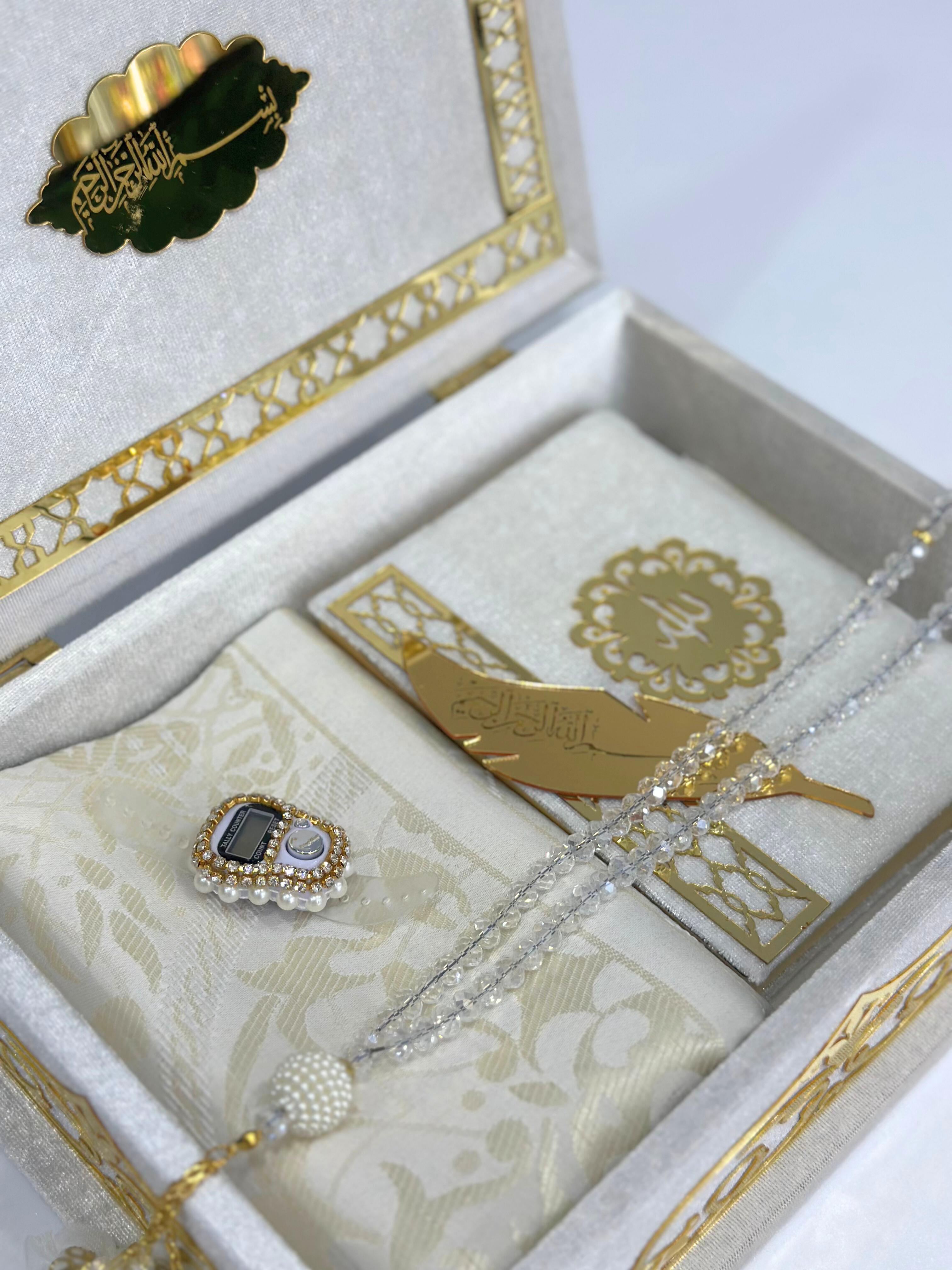 Metal Sade Desenli Kadife Kaplı Lüks Kutulu Yasin Seti - (28*20*8 cm, 1750 gr) *Özel Tasarımlı Lüks Kutu 28*20*8 cm Ebatlarındadır. *1 Adet Kadife Kaplı Çanta Boy(16*12 cm, 128 Sayfa) Pleksili Yasin *1 Adet İsme Özel Tafta Seccade Krem (68x110 Cm - 200 Gr) *1 Adet 99’lu İnci Tesbih *Lüks Taşlı Zikirmatik *İkra Yazılı.