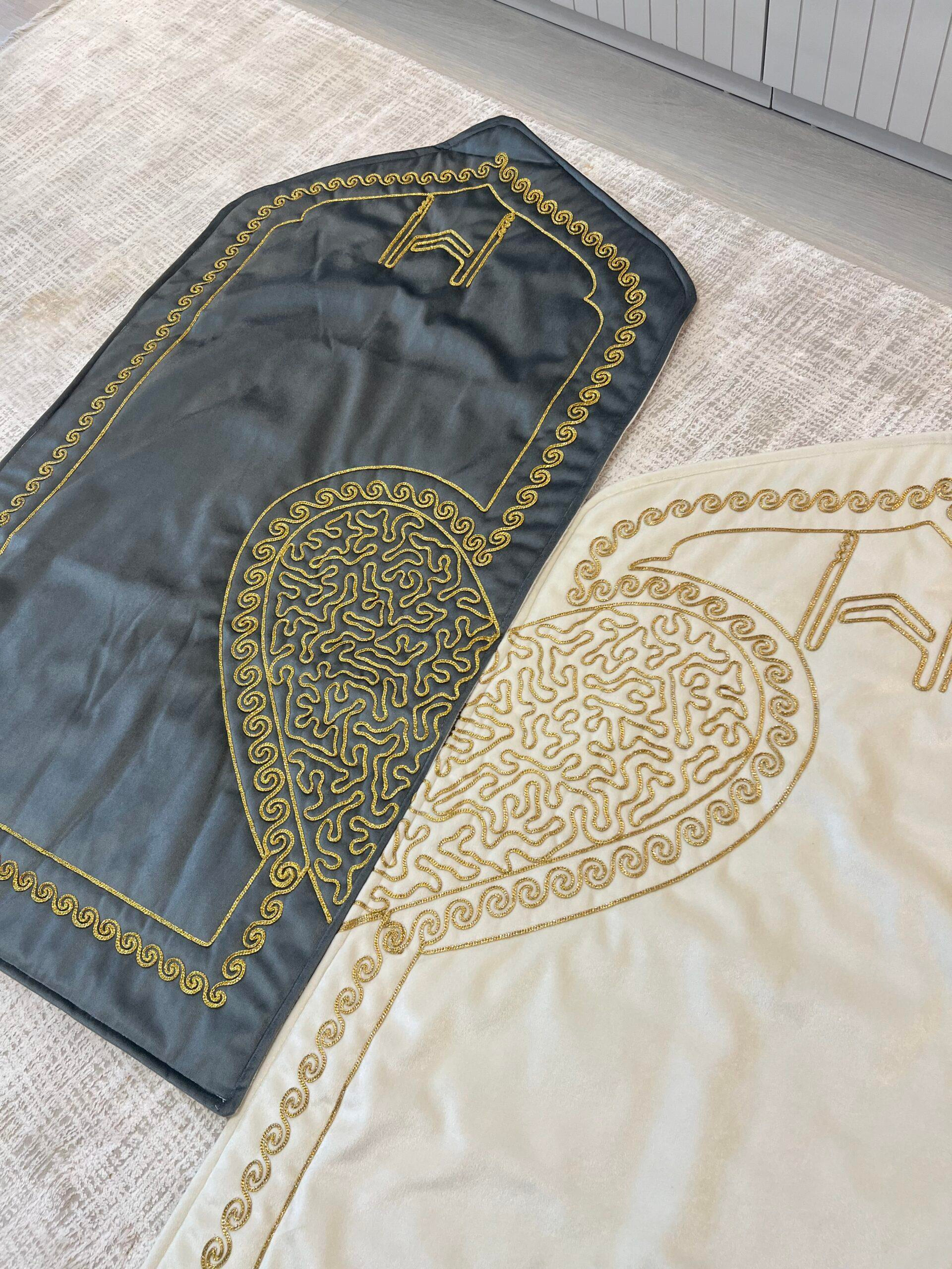 Bu şık ve zarif çift seccade, yüksek kaliteli nakışlı elyaflı astarlı ithal kadife kumaştan üretilmiştir. İleri düzey işçilikle işlenen nakış detayları, seccadenin her iki yüzeyinde de estetik bir görünüm sunar. Kadife kumaşın yumuşak dokusu, seccadenin üzerinde namaz kılarken rahatlık sağlar. Elyaflı astar ise ekstra bir konfor ve dayanıklılık sunar. Hem estetik hem de fonksiyonel özellikleriyle, hem günlük kullanım hem de özel günlerde tercih edilebilecek bir üründür.