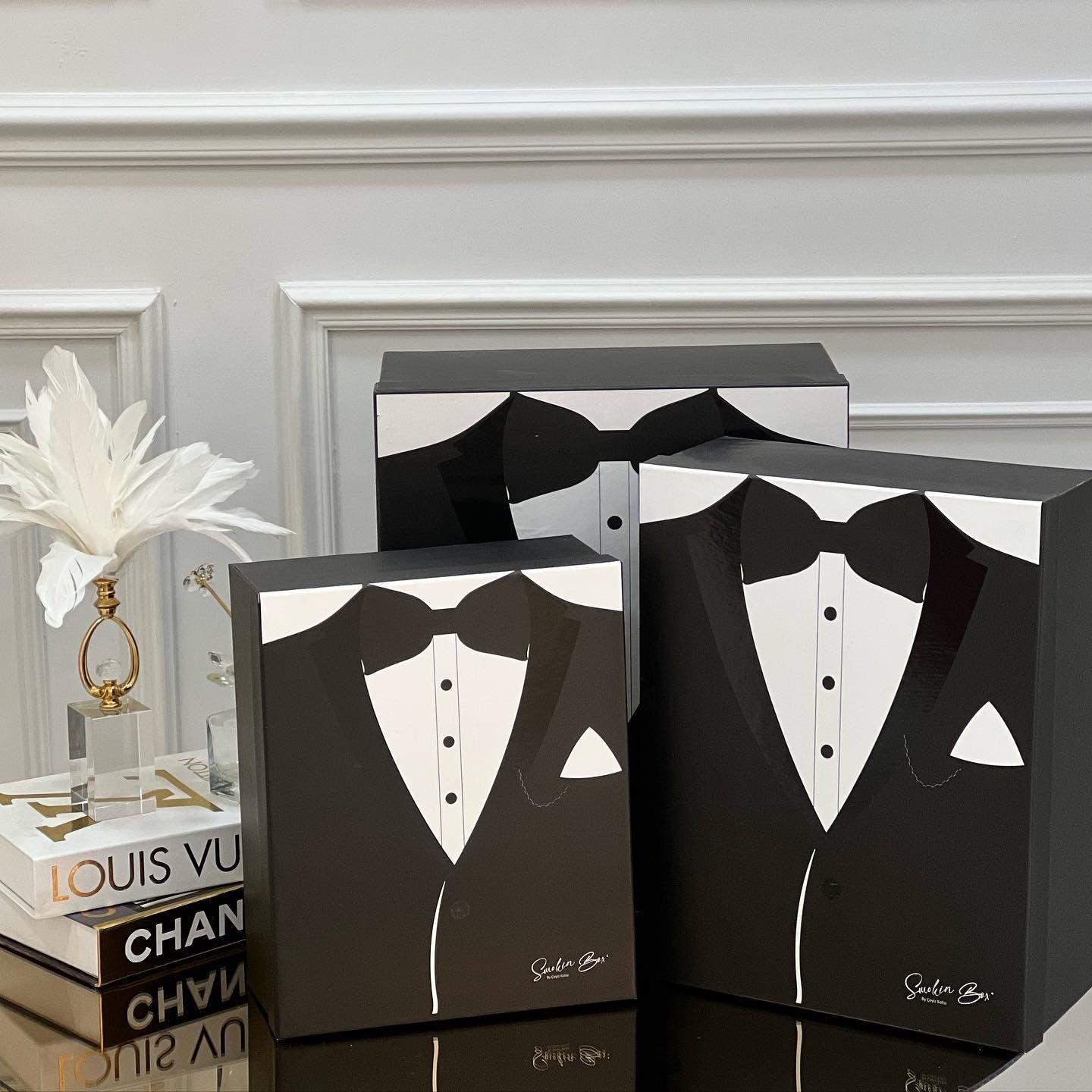 Hediyelik Damat Nişan Seti Büyük boy Damat kutusu : 38x32x15cm , Orta boy Damat kutusu : 34x28x13cm, Küçük boy Damat kutusu : 31x23x12cm , Smokin tasarımlı 3' lü kutu seti, damat bohçası ve çeyiz hazırlıkları için şık ve özel bir seçenektir. Hediye ve saklama için idealdir.