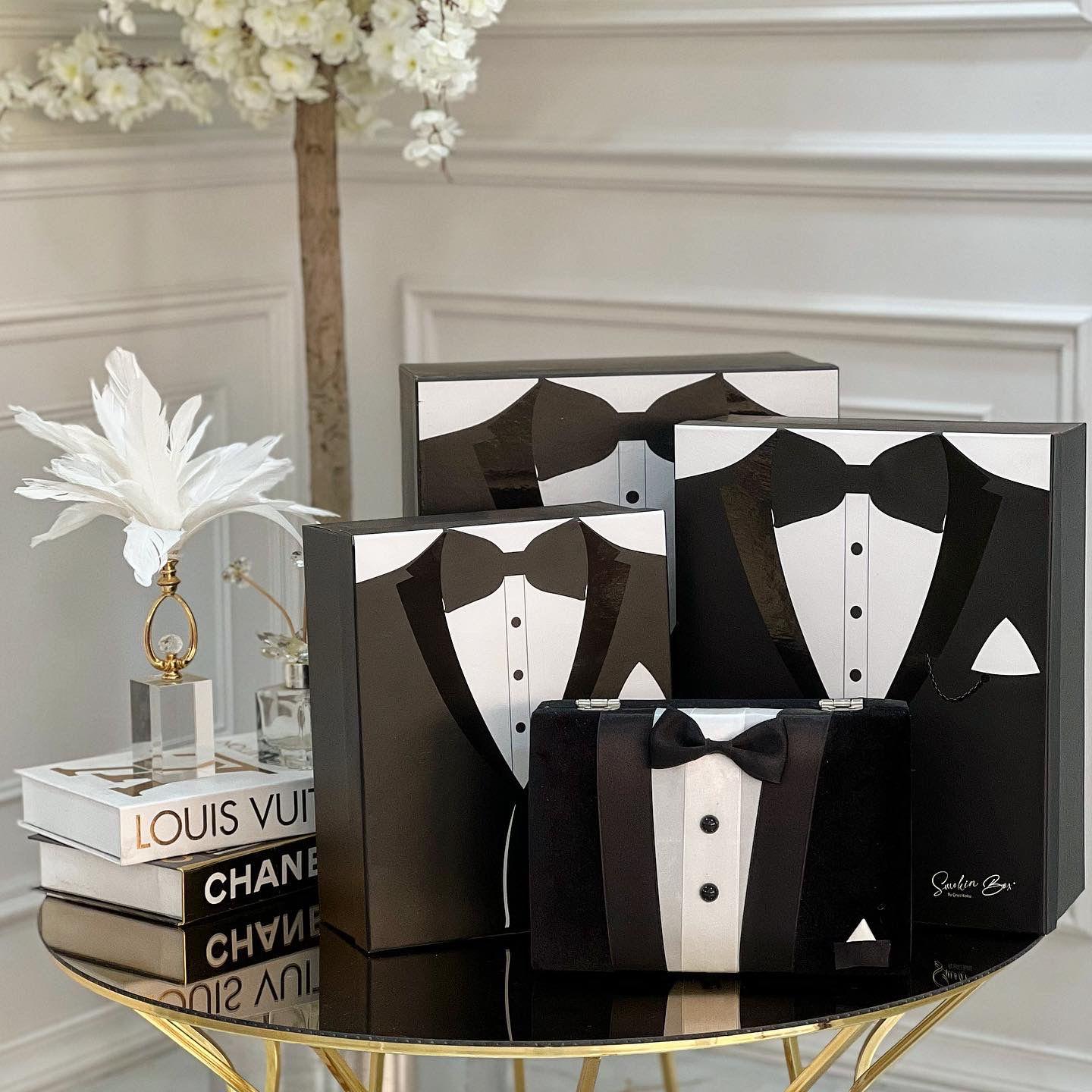 Smokin tasarımlı 4' lü kutu seti, damat bohçası ve çeyiz hazırlıkları için şık ve özel bir seçenektir. Hediye ve saklama için idealdir.
