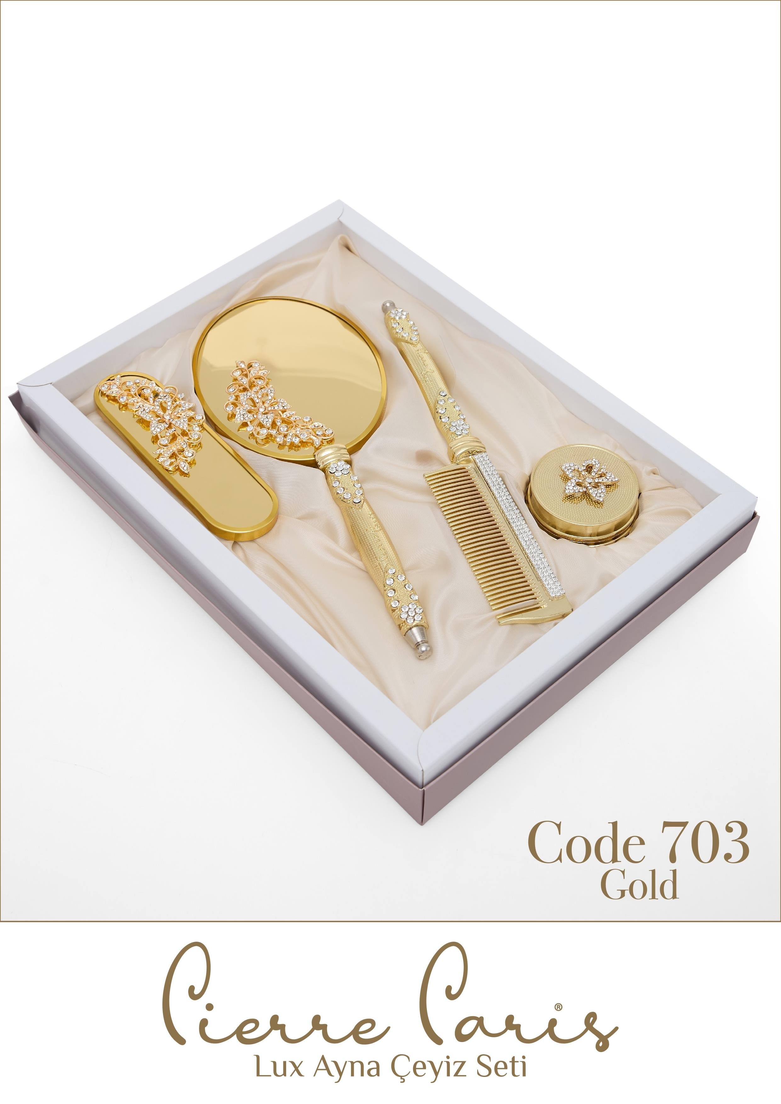 Gold renkte tasarlanmış, zarif ve şık ayna, tarak ve aksesuar seti. Çeyiz sandıklarına lüks bir dokunuş katar, özel günler için ideal.